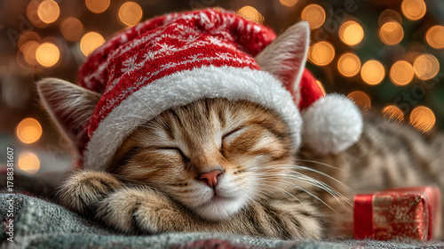 Sleeping kitten wearing festive Santa hat with holiday decorations nearby
