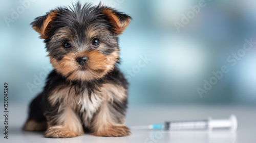 Small pet puppy sits calmly in vaccination scene with syringe nearby, capturing tender moment of care and health awareness for animals
