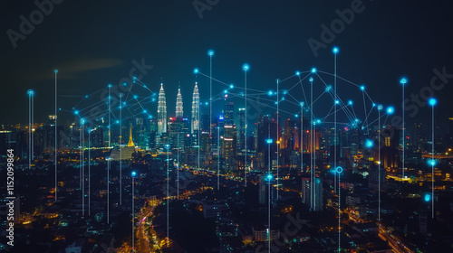 Smart digital city with connection cyber security network reciprocity over the cityscape . future smart wireless digital city and social media networking systems that connects people within the city