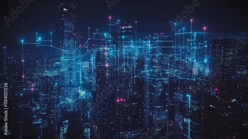 Smart digital Innovation city with connection network reciprocity over the cityscape. of future smart wireless digital city and social media networking systems that connects people with in city