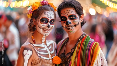 Smiling couple with Day of the Dead face skull paint in festive attire. Man and woman celebrating Dia de los Muertos. Concept of Mexican tradition, celebration, festival, Halloween