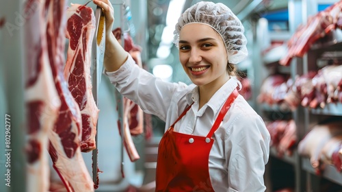 Smiling female butcher in red apron inspecting quality of meat at a local butcher's shop. Modern professional in food industry. Fresh produce and service. AI