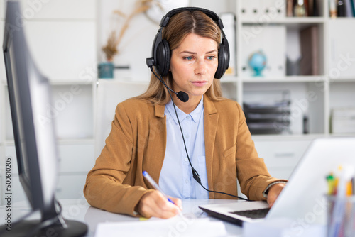 Smiling female operator talking with customer using headset at company office
