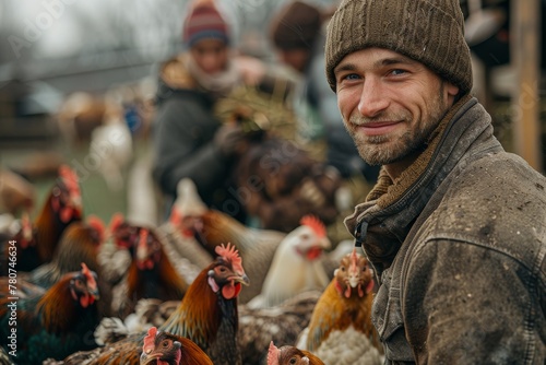 Smiling man in a beanie surrounded by colorful roosters in a rural farm