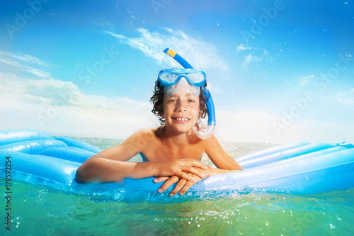 Smiling nice Caucasian boy swim on matrass