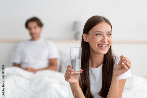 Smiling pretty millennial european wife hold glass of water and pill, husband sits on bed in bedroom interior