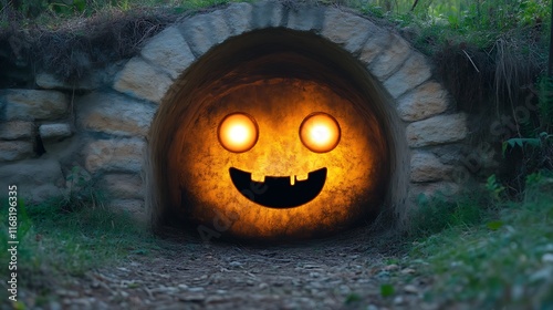 Smiling Stone Tunnel: Glowing Jack-o'-lantern Face in Rustic Setting