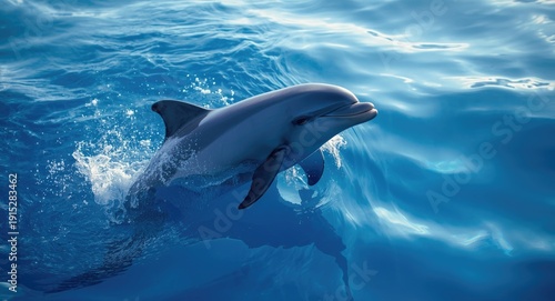 Smooth dolphin breaching vibrant blue waters to depict a peaceful aquatic world