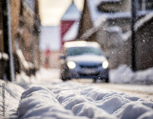 Śnieg zaspy na ulicy i samochody
