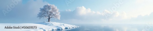 Snowdrifts pile high around the base of a solitary tree on a frozen lake, tree, snowy scene