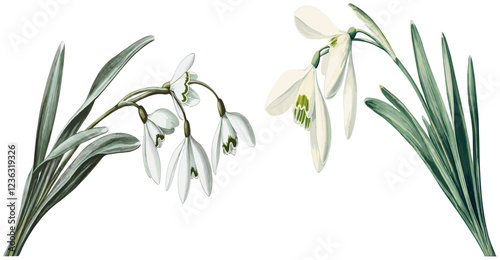Snowdrop flower botanical art in an antique style, capturing the delicate white petals and serene beauty of winter in a vintage design.