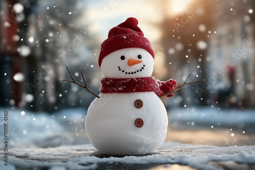 Snowman in a red scarf and hat with twig arms raised, standing in a snowy street on a sunny day, blurred buildings and snow-covered trees in the background