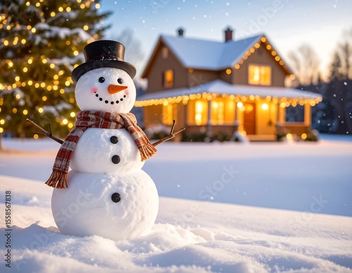 Snowman in snowy yard with house