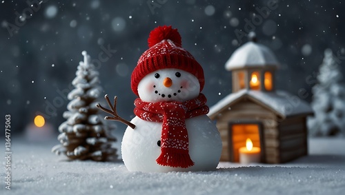 Snowman Wearing Red Knitwear Surrounded by Snowy Trees and Cottage