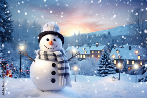 Snowman with the hat and scarf standing on the snow in winter, christmas trees on the side and behind it