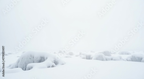 Snowy landscape with rocks and snow on a cloudy day