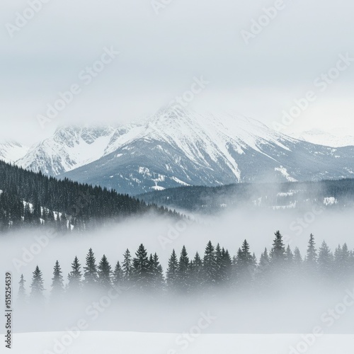 Snowy mountain landscape with coniferous trees emerging from dense fog under an overcast sky