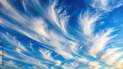 Softly fading clouds with wispy strands of cirrus against a pale blue sky, clouds, cerulean, airy, soft focus