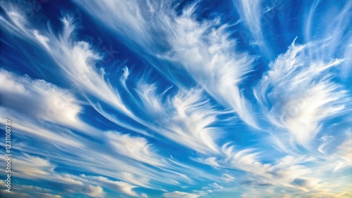 Softly fading clouds with wispy strands of cirrus against a pale blue sky, hazy, cerulean