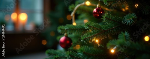 Softly glowing electric candles behind a lush green Christmas tree, holiday decoration, green Christmas tree, winter wonderland