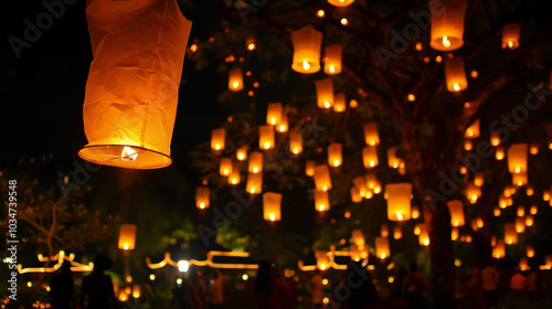 Softly glowing lanterns hang in the night air, creating a magical atmosphere as people gather to celebrate under the enchanting glow