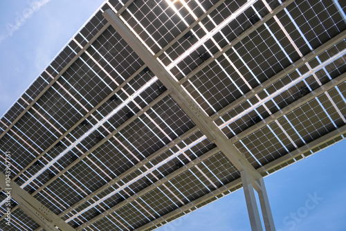 Solar panels installed as shade roof over parking lot for parked electric cars for effective generation of clean electricity. Photovoltaic technology integrated in urban infrastructure
