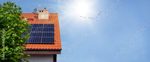 Solar Panels on roof. Renewable Energy Concept, Photovoltaic - BANNER. Copy space for text.