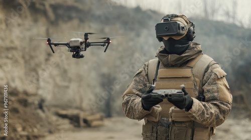 Soldiers, army operations personnel wearing military uniforms, glasses Controlling the drone used in the military