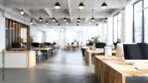 Spacious office features wooden desks, large windows, and modern decor. The design promotes collaboration and productivity in a bright atmosphere filled with natural light.