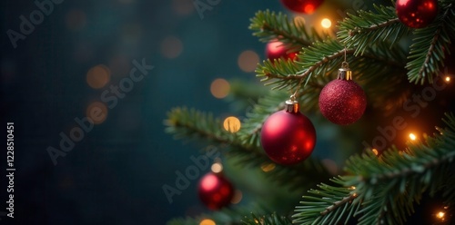 Sparkling glowing berries adorn the Christmas tree, colorful ornaments, sparkling decorations