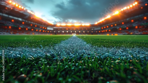 Spectacular Sports Stadium: Glowing Floodlights and Empty Green Grass Field - Professional Sports Background for Advertisement
