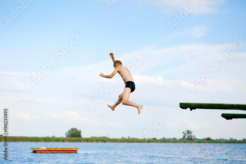 sporty cute young boy jumps very high from pier and having fun on his vacation by the sea