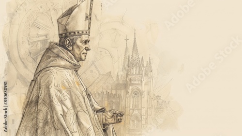 St. Hugh of Lincoln in Bishop's Robes in 12th-Century English Cathedral, Biblical Illustration, Beige Background, Copyspace