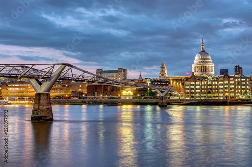 St. Paul's cathedral and the Millennium Bridge in London, UK, after sunset