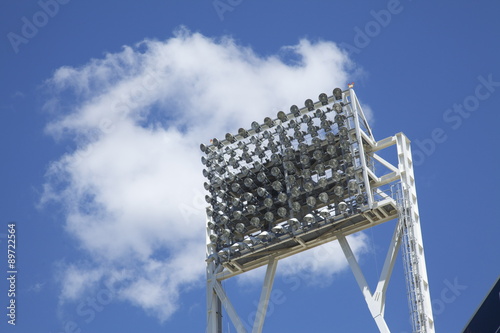 Stadium lights at day against a blue sky and clouds