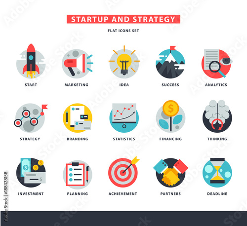 Startup business icons vector start up strategy marketing idea innovation or businessplanning illustration of rocket or light bulb isolated on white background