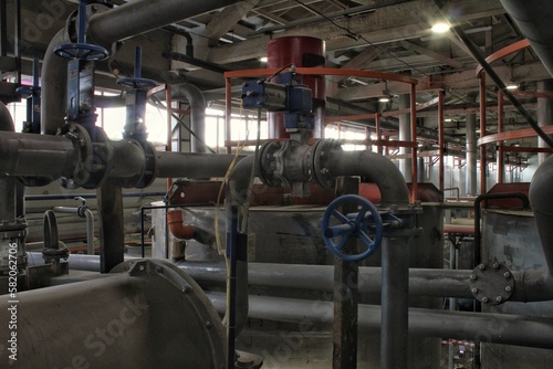 Steel pipes, tubes, steam turbine, valves, machinery, cables of modern factory. Gas boiler room industrial zone power plant. Pump engineering station. Technical equipment system. Energy water concept.