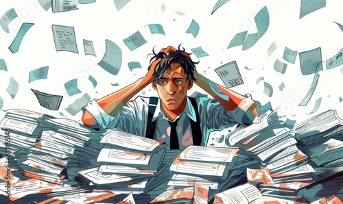 Stressed businessman surrounded by piles of invoices and bills