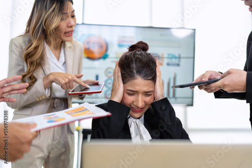 Stressed overwhelmed business worker feels tired at work overload exhausted suffering from headache