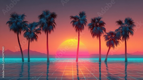 Striking Palm Tree Silhouettes Framed by Neon Blue and Pink Outlines Against a Vaporous Landscape Inspiring Tropical Dreams and Creative Energy