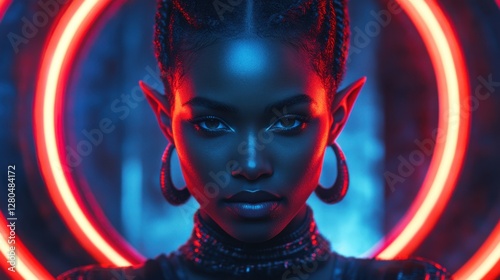 Striking portrait of a young woman with braided hair surrounded by neon lights in an urban setting