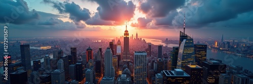 Stunning aerial view of New York City at sunset, showcasing iconic skyscrapers and a vibrant sky. Perfect for travel, real estate, and urban lifestyle projects.