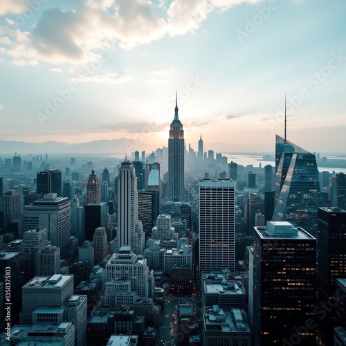 Stunning city skyline at sunset featuring iconic skyscrapers and a vibrant atmosphere.