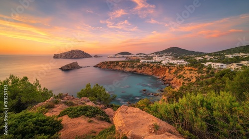 Stunning coastal landscape of Ibiza island with rounded mountains, rugged cliffs, soft pink sunset sky, lush green vegetation and distant islets, viewed from high viewpoint over calm sea waters.