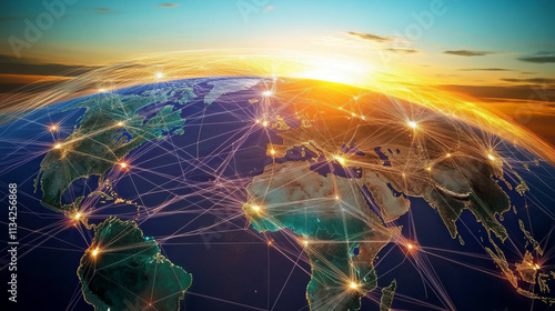 stunning view of Earth from space, showcasing global connections and networks. sunrise illuminates planet, highlighting continents and interconnected lines