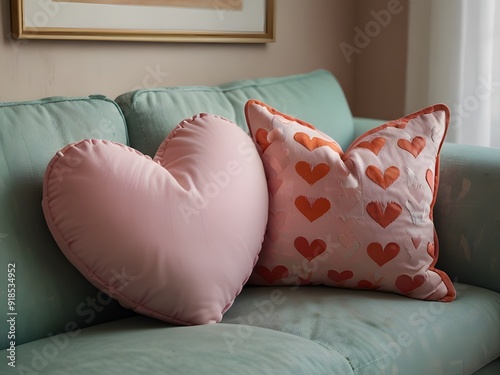 Stylish Valentine's Day living room, where a soft pink sofa is decorated with red heart pillows and candles