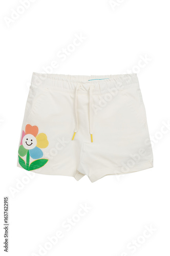 Stylish white swim shorts with cheerful floral smiley face design for summer vibes