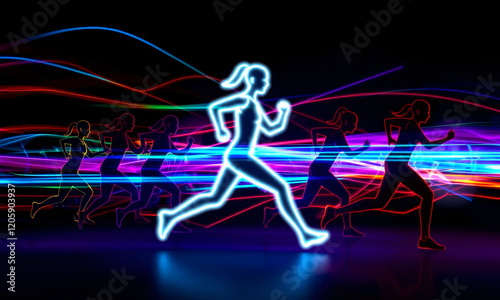 Stylized people in athletic poses like running. Their forms are highlighted with neon streaks