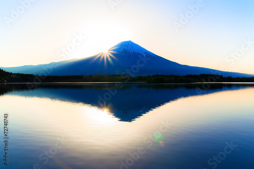 Sun shine and inverted Mount Fuji reflected in Lake Tanukiko