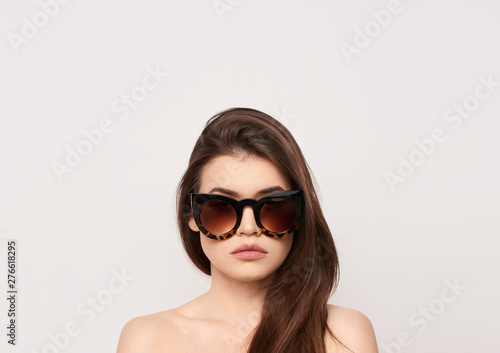 sunglasses girl, close up studio shot of beautiful fashion young woman model with long hair looking at camera . while posing against clean white blank copy space wall for your content